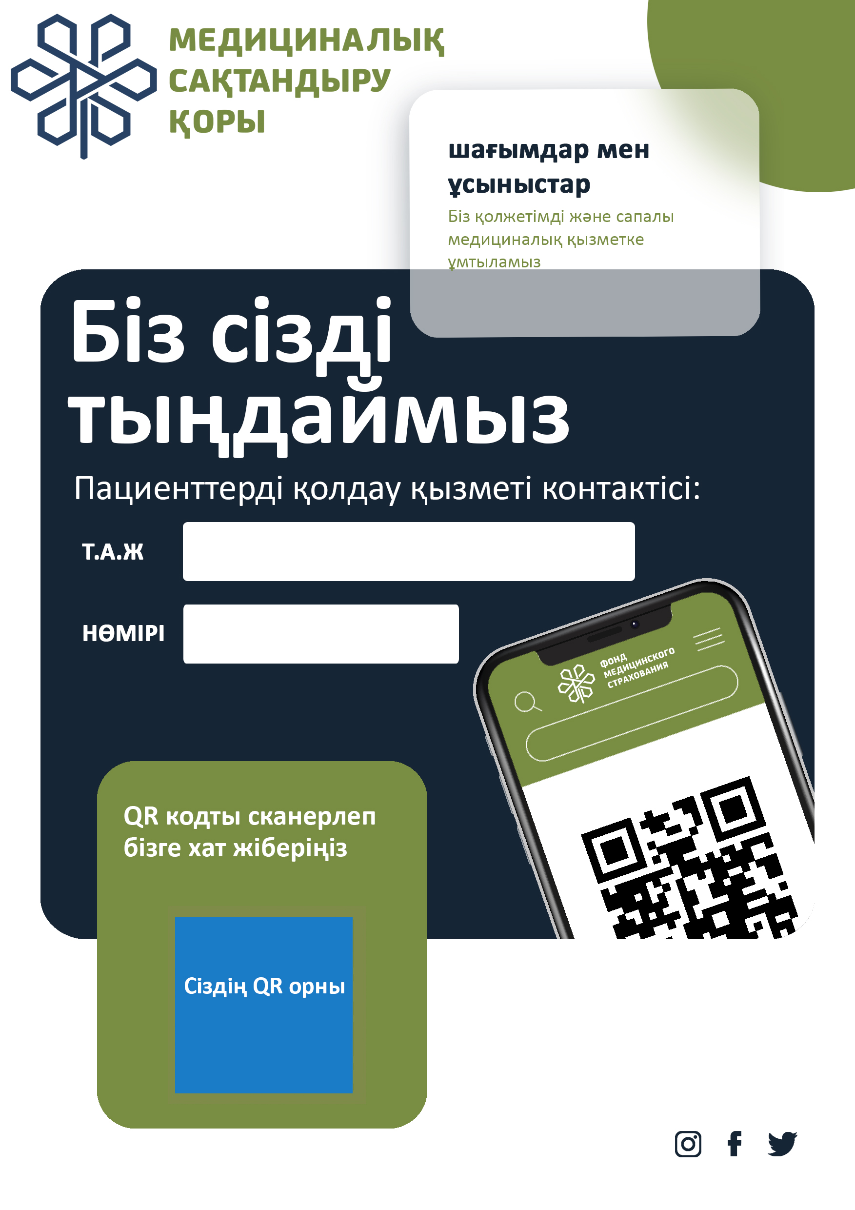 Егер сіздің тағы да сұрақтарыңыз болса немесе медициналық көмек алуда қиындықтар туындаса, өз емханаңыздағы «Пациенттерді қолдау қызметіне» жүгініңіз. Ал ол жерде мардымды жауап ала алмасаңыз, Қордың өзіңізге ыңғайлы арналары бойынша өтініш-шағымдарыңызды қалдыра аласыз: